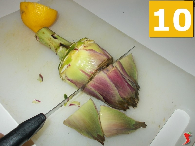 Quindi strofinate i gambi con il limone (7) man mano che li pulite e poi metteteli tutti nella planetaria (8) con il limone. Ora iniziate a sfogliare il fiore togliendo tutte le foglie esterne (9) fino a raggiungere quelle interne più morbide e bianche. Le foglie esterne sono in realtà delle brattee.