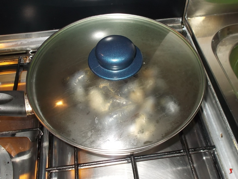 Nel frattempo avrete pulito le cozze, grattando via tutte le barbette e le impurità. Quindi eseguite la stessa operazione fatta per le vongole, mettendo le cozze in una padella grande sul fuoco vivo finché non si aprono per rilasciare l'acqua.