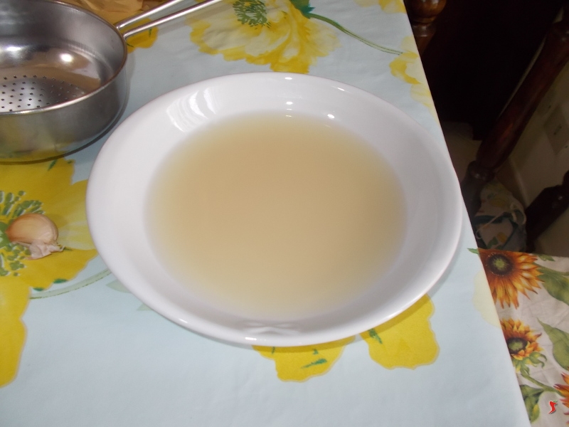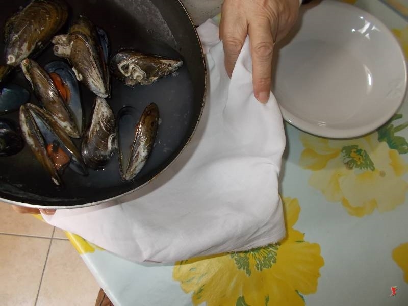 Fate raffreddare i molluschi e quindi toglieteli dalle rispettive padelle per metterle a parte in una scodella. Quindi prendete un colino e mettetevi un apposito panno di cotone per filtrare le acque delle padelle in un'altra scodella.