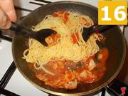 Nel frattempo avrete messo una pentola sul fuoco per far bollire l'acqua per la pasta. Salate e poi aggiungete gli spaghetti nell'acqua (13) facendoli cuocere per il tempo necessario (14) alla cottura al dente. Una volta cotti, scolateli nello scolapasta e poi saltateli nella padella (15) con il condimento.