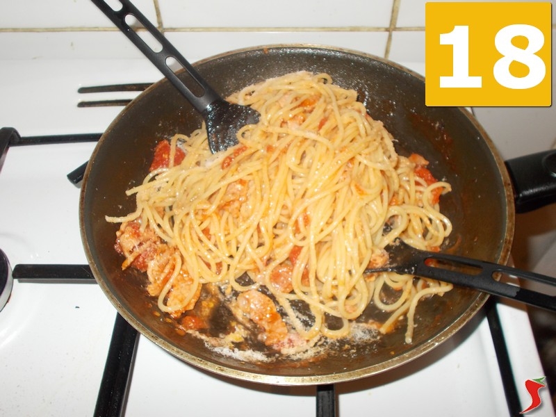 Quindi mescolate bene (16) per far amalgamare il sugo con la pasta, e aggiungete il pecorino (17), per mescolare bene (18) di nuovo. Impiattate subito, e spolverate ogni piatto con un pochino di pecorino ancora, per portare in tavola ben caldo. Abbinate con un buon vino rosso dai toni non troppo maturi.
