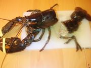 Ora viene la parte più delicata per chi è sensibile. Mantenete gli elastici sulle chele fino alla fine. Dovrete prendere l'aragosta viva e infilare un coltello grande dietro la testa per trapassarla, in modo da ucciderla subito. Quindi dovrete tagliarla in pezzi, aprirne la testa in due tagliandola per la lunghezza per eliminare le budella e la parte celebrale. Rompete leggermente le chele con il dorso del coltello e in ultimo togliete gli elastici. Quindi prendete tutti i pezzi d'aragosta e metteteli in una ciotola con tutta l'acqua da esse fuoriuscita.