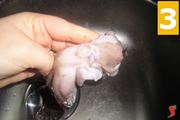 Per prima cosa , se avete dei moscardini freschi e sporchi occorre pensare alla loro pulizia. Per prima cosa rivoltate la sacca superiore per eliminare le interiora. Di solito anche il pescivendolo compie questa prima operazione prima di vendervi i moscardini. Poi eliminiate gli occhi e la sacca che si trova proprio dietro ad essi (1), lavate sotto acqua corrente ciascun moscardino (2) e poi togliete il 'becco' ossia la parte ossea della zona inferiore di ciascun moscardino (3). Lo trovate all'attaccatura dei tentacoli.