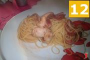Lasciate cuocere il sugo fino a che non si sarà un po' ristretto (10). Cuocete la pasta e scolatela al dente. Saltatela in padella (11) con i moscardini e servite aggiungendo per ogni porzione dei moscardini interi che fanno da decorazione e danno anche molto più sapore alla pasta (12).