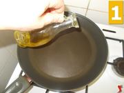 Questa ricetta abbastanza particolare va cominciata con il versare cinque cucchiai di olio extravergine di oliva (1) in una padella ampia ed antiaderente per farli scaldare a fuoco medio. Una volta caldo l'olio unite prima il curry (2) e quindi anche lo zafferano (3). Mescolate con un cucchiaio di legno per sciogliere gli ingredienti nell'olio.