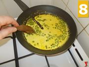 Nel frattempo avrete messo a bollire abbondante acqua salata per lessare la pasta. Mettete gli spaghetti nell'acqua (7) e fateli cuocere, mentre mescolerete bene la panna (8) ancora. Una volta cotta la pasta scolatela e quindi saltatela in padella (9), tenendo un pochino di acqua di cottura a parte. Mescolate bene per far assorbire agli spaghetti il condimento, e se necessario aggiungete un pochino di acqua di cottura. Quindi impiattate e servite immediatamente in tavola molto caldo, accompagnando per chi vuole, con del pepe nero da macinare fresco.