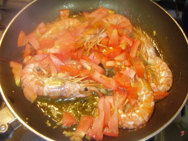 Prendete quindi una padella grande e ponete cinque cucchiai d'olio, l'aglio e il peperoncino e iniziate a scaldare a fuoco medio. Quando l'aglio inizia a friggere mettete i gamberoni e girate bene, facendoli insaporire qualche minuto. Aggiungete quindi il vino bianco e lasciate sfumare qualche minuto a fuoco vivace.