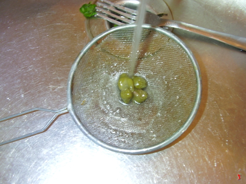 Prendete anche le acciughe e tagliatele in pezzetti piccoli, mettendole da parte. I capperi invece dovranno essere sciacquati sotto l'acqua corrente per desalinizzarle. Utilizzate un colino per rinfrescarle e lavarle dal sale.