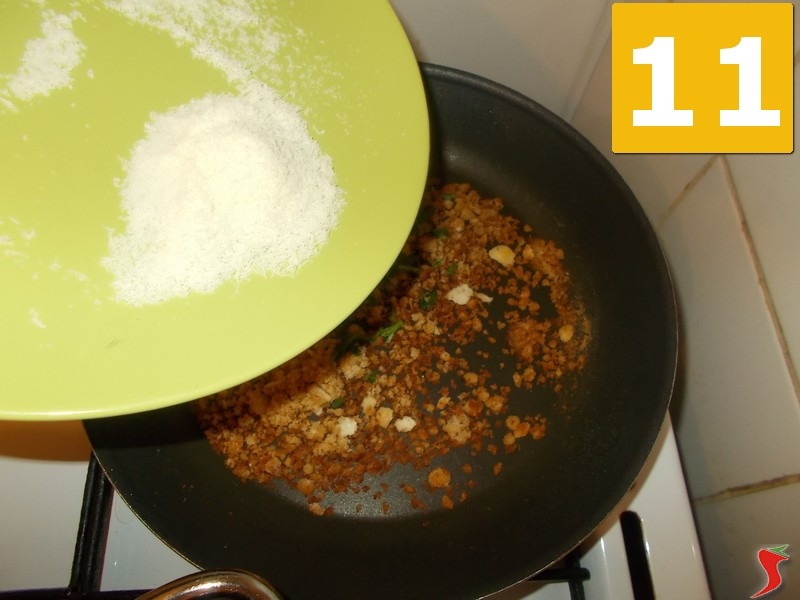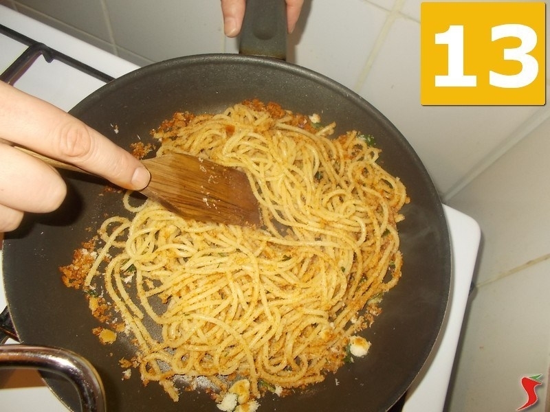 Ora spolverate il pan grattato con il prezzemolo tritato (10) e con il pecorino (11). Mescolate bene per amalgamare il tutto. Nel frattempo avrete lessato gli spaghetti. Scolateli, tenendo un po di acqua di cottura da parte, e saltateli nella padella (12) con il pangrattato tostato, mettendo il fuoco al minimo.