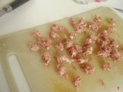 Quindi iniziate a incidere le salsicce longitudinalmente la pelle e quindi sfilatele dall'interno togliendole completamente dalle budella. Quindi tagliatele in piccoli pezzetti e metteteli da parte.