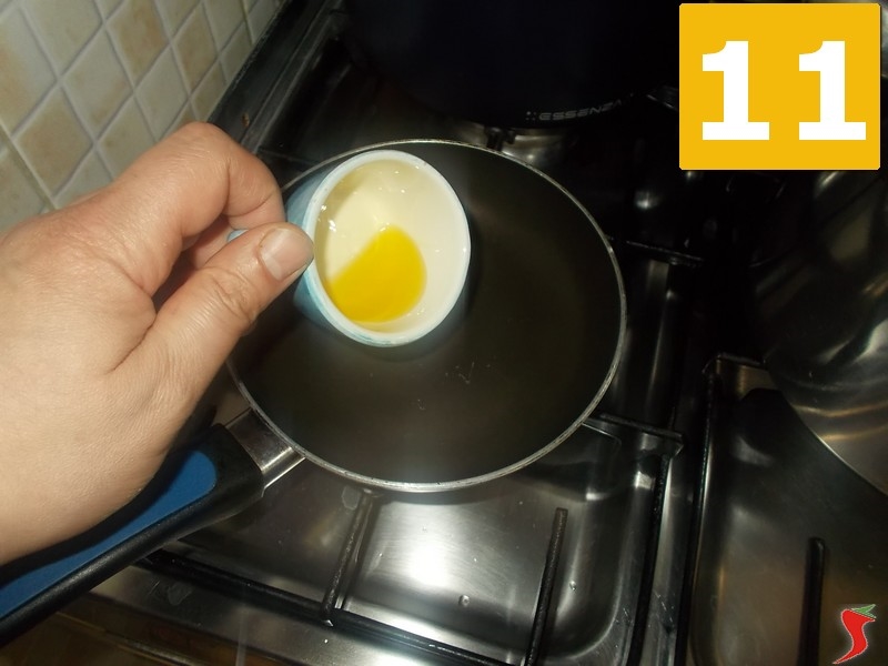 Nel frattempo che le sarde cuociono tritate finemente la cipolla (10) e quindi versate cinque cucchiai di olio extravergine di oliva (11) a scaldare in una padella piccola. Una volta caldo mettete a soffriggere la cipolla (12) per un minuto a fuoco medio.