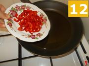 Aggiungete l'olio extra vergine di oliva in una padella grande antiaderente (10), quando sarà ben caldo, mettete l'aglio intero con la camicia (11), e appena sentite soffriggere, aggiungete il peperone tagliato a fettine (12).