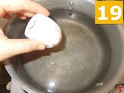 Salate l'acqua della pasta (19), ed una volta che questa avrà raggiunto il bollore, versatevi gli spaghetti (20), lasciate cuocere come indicato sulla confezione, ed una volta cotta, scolate gli spaghetti in una scolapasta (21).