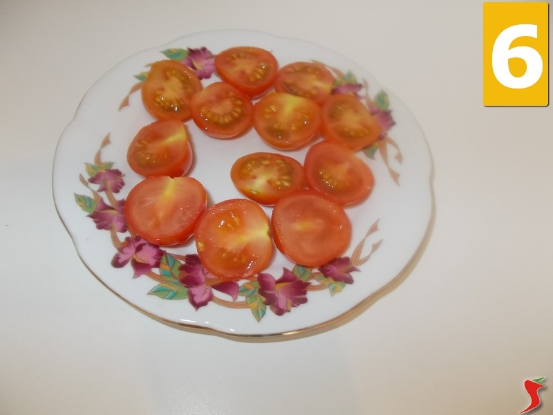 Adesso lavate i pomodorini sotto l'acqua (4), dopo poneteli su un tagliere e divideteli a metà, sempre utilizzando un coltello seghettato (5), mettete da parte su un piattino piano (6).