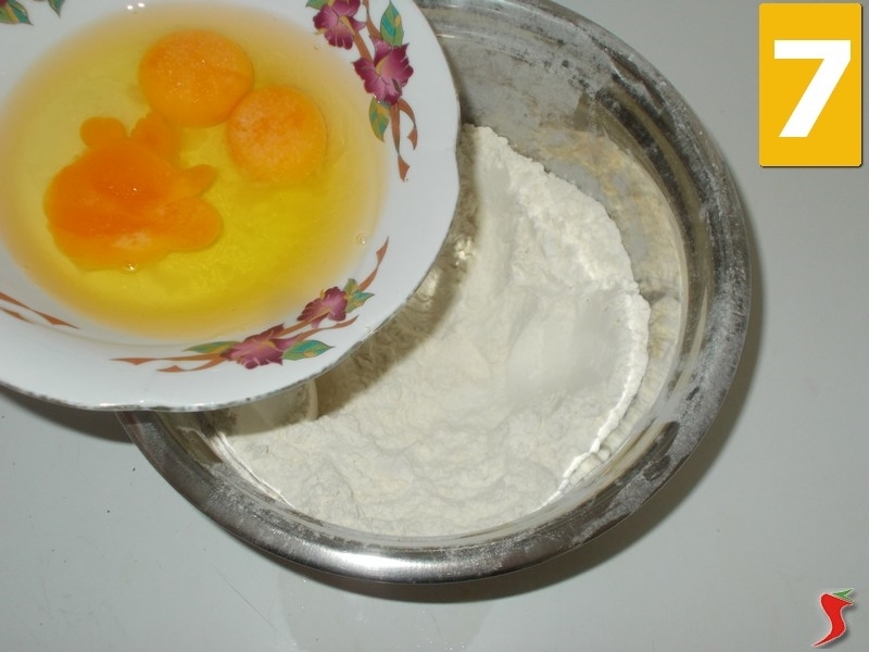 Poi dovete rompere le uova in una piccola scodella (4), e non direttamente nella farina. In questo modo potrete individuare i pezzetti di guscio che spesso finiscono nelle uova quando vengono rotte. Eliminateli se ci sono, e quindi aggiungete un pizzico di sale (5) alle uova. Infine, tornate ad occuparvi della farina, facendo un buco al centro (6) con il cucchiaio, dove poi verranno messe le uova.