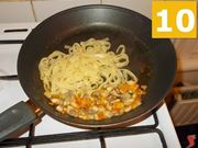Nel frattempo avrete messo a bollire l'acqua salata per lessare le tagliatelle. Fatele cuocere per il tempo indicato in confezione e una volta pronte scolatele per saltarle nella padella (10). Mescolate bene per amalgamare il tutto e quindi unite anche il parmigiano grattugiato (11). Mescolate ancora e quindi unite anche il prezzemolo tritato (12) e una spolverata di pepe nero. Quindi impiattate e servite subito in tavola ben caldo, con il macinino del pepe nero affianco.