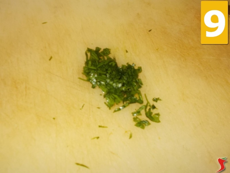 Una volta sciolto il burro aggiungete il salmone a dadini (7) e quindi fatelo cuocere (8) per circa dieci minuti. Nel frattempo prendete il prezzemolo, lavatelo bene sotto l'acqua corrente e tritatelo finemente (9).