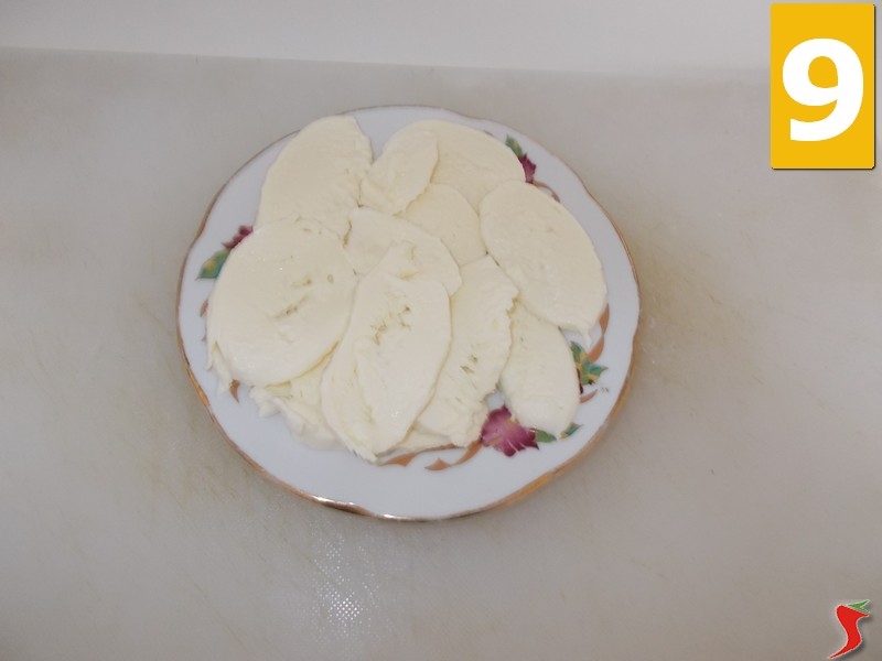 A questo punto mettete la mozzarella su un tagliere ed iniziate a tagliarla con un coltello dalla lama lunga dall'estremità (7), poi proseguite verso il centro (8), ed una volta terminata la mozzarella, mettetela da parte su un piattino (9).