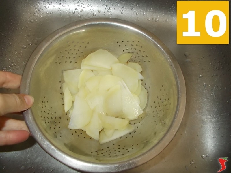 Adesso trascorso il tempo necessario di cottura delle patate, scolatele su uno scolapasta (10), poi prendete una pirofila rettangolare e versate l'olio extra vergine di oliva sul fondo (11), dopo disponete con un cucchiaio le patate lesse sul fondo (12).