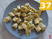 In seguito, tagliare la pasta in tanti piccoli quadrati (31), e farcirli piano piano, uno alla volta (32), fino a terminare la quantità di pasta realizzata (33).
