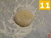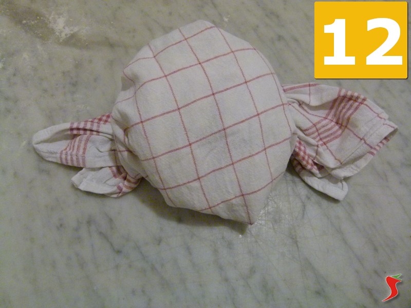 Ora è possibile impastare il tutto (10), continuando progressivamente fino a creare un composto omogeneo e liscio (11). Una volta creato l’impasto, riporlo in un canovaccio e lasciarlo riposare per circa 30 minuti (12).