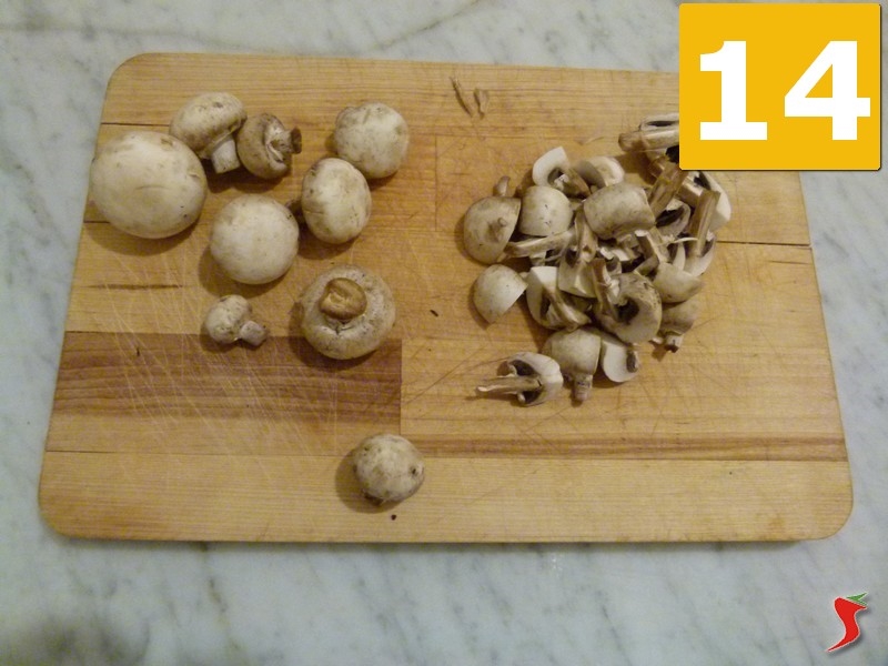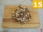 Nell’attesa che la pasta riposi si può iniziare con la preparazione della farcitura e del sugo. Quindi, prendere i funghi e riporli su di un tagliere (13), dopo averli puliti accuratamente, iniziare a tagliarli (14) fino a terminare tutta la quantità necessaria alla ricetta (15).