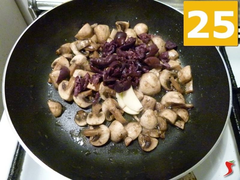 Mentre i funghi sono in cottura, si può procedere con le oliva (19). Quindi, iniziare a snocciolare tutta la quantità di olive necessarie alla ricetta (20) e, in seguito, tagliarle in piccole parti (21).