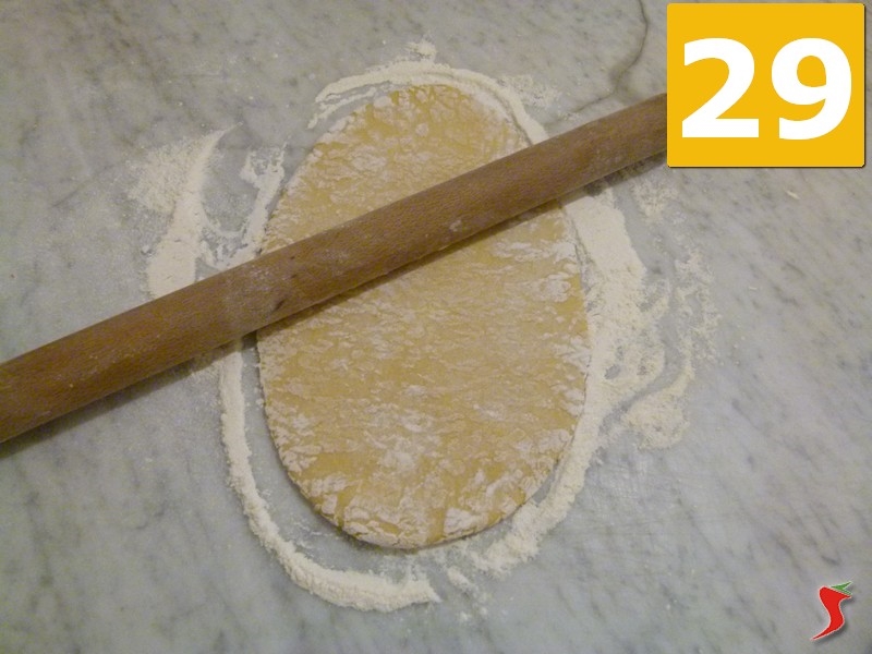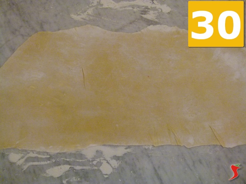 Ora che il sugo e la farcitura sono pronti, si può prendere nuovamente l’impasto, riponendolo su di una superficie con della farina (28). Prendere un mattarello e iniziare a stendere la pasta (29), fino a che questa non presenti una sfoglia sottilissima (30).