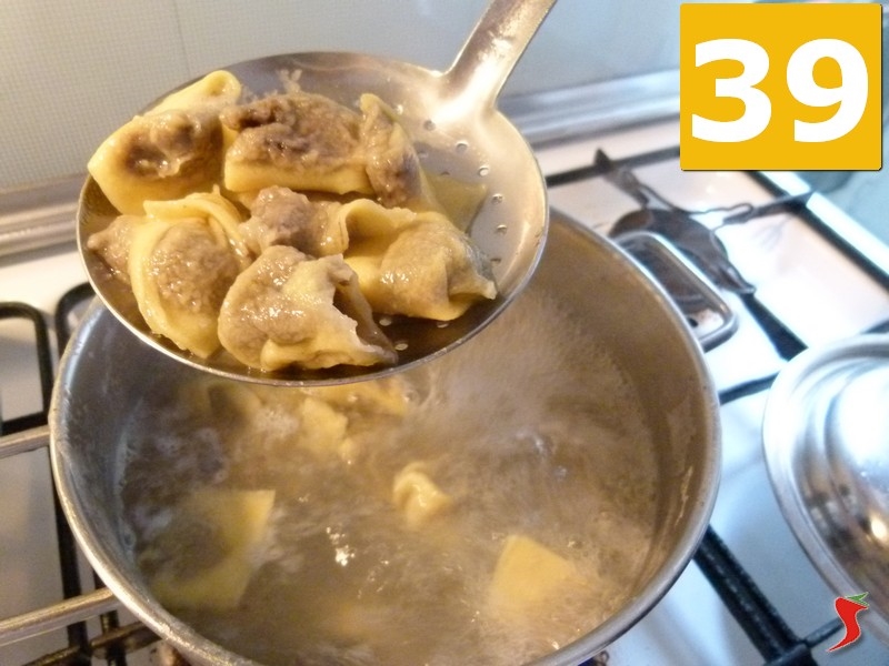 Appena tutti i tortellini sono stati creati (37), li si può riporre in una pentola con dell’acqua in ebollizione per la cottura (38). Non appena la cottura della pasta è terminata, con l’ausilio di una spatola, iniziare ad estrarli dall’acqua (39).