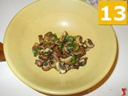 Nel frattempo mettete l'acqua salata a bollire per lessare i tortellini e una volta pronti scolateli. Quindi in una planetaria o una ciotola grande mettete i funghi raffreddati (13), versateci sopra la crema di ricotta (14) e infine i tortellini (15). Mescolate bene il tutto.