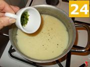 Mescolate bene la panna (22) per amalgamarla alla vellutata, e spegnete il fuoco. Se lo desiderate spolverate con del pepe nero (23) e quindi tritate il prezzemolo per aggiungerlo (24) alla vellutata. Infine aggiungete un filo d'olio extravergine di oliva.