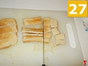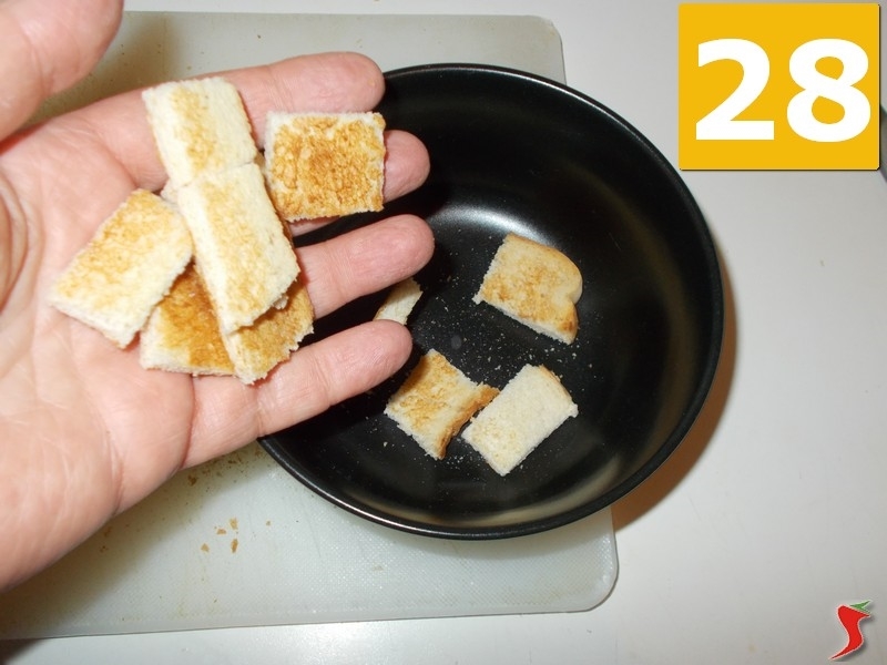 Nel frattempo tostate il pancarré (25) con il tostapane e poi tagliatelo prima a listelle (26) e poi a dadini (27).