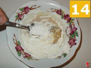 Nel frattempo rompete le due uova in una ciotolina (10) e aggiustatele con poco sale (11). Quindi sbattetele bene (12) con la forchetta, finché non diventa tutto ben rosso.