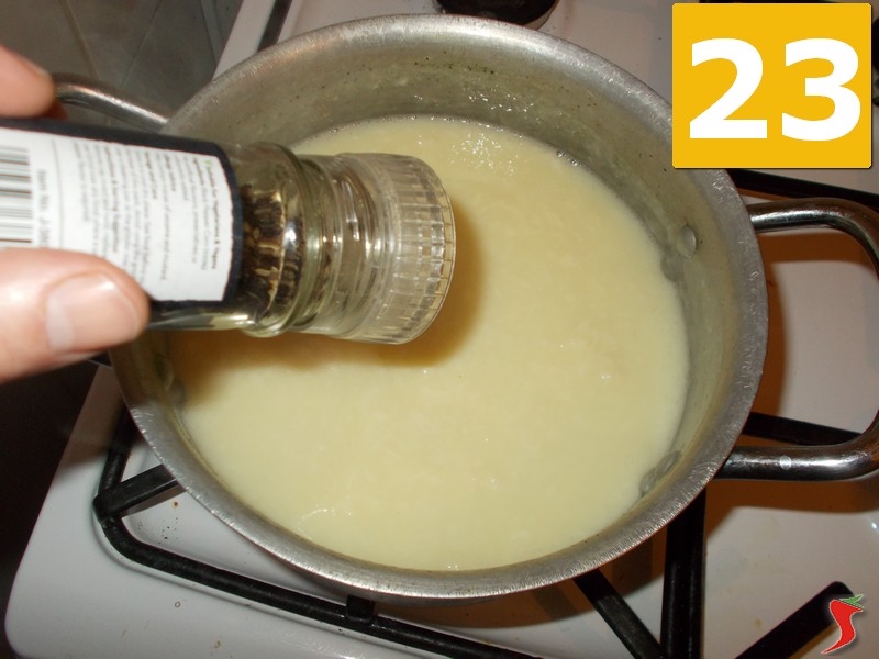 Nella stessa pentola che stavate usando, versate la vellutata (19) ottenuta al frullatore, e riaccendete il fuoco, mescolando bene (20). Quando è di nuovo ben calda, versateci dentro la panna da cucina (21).