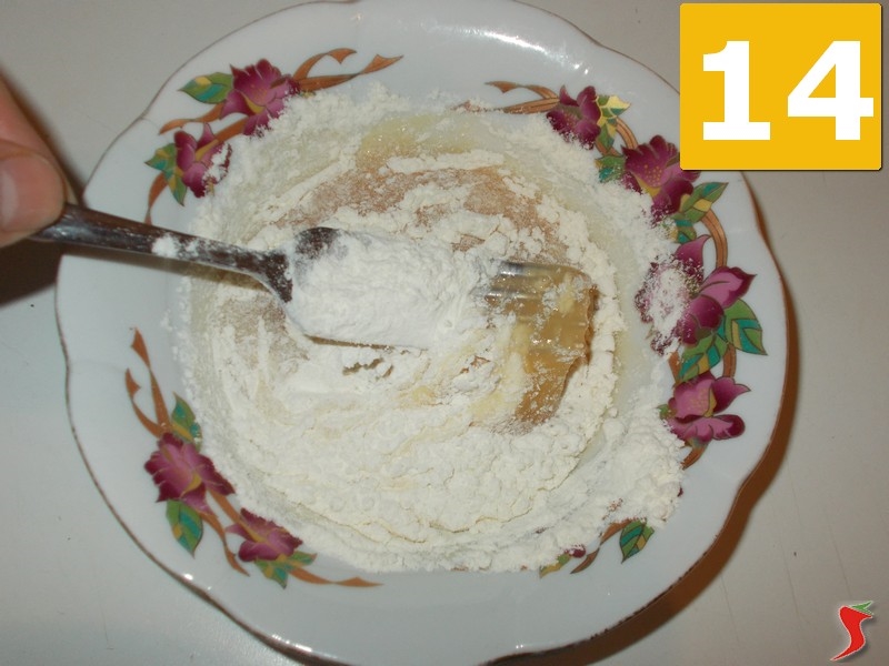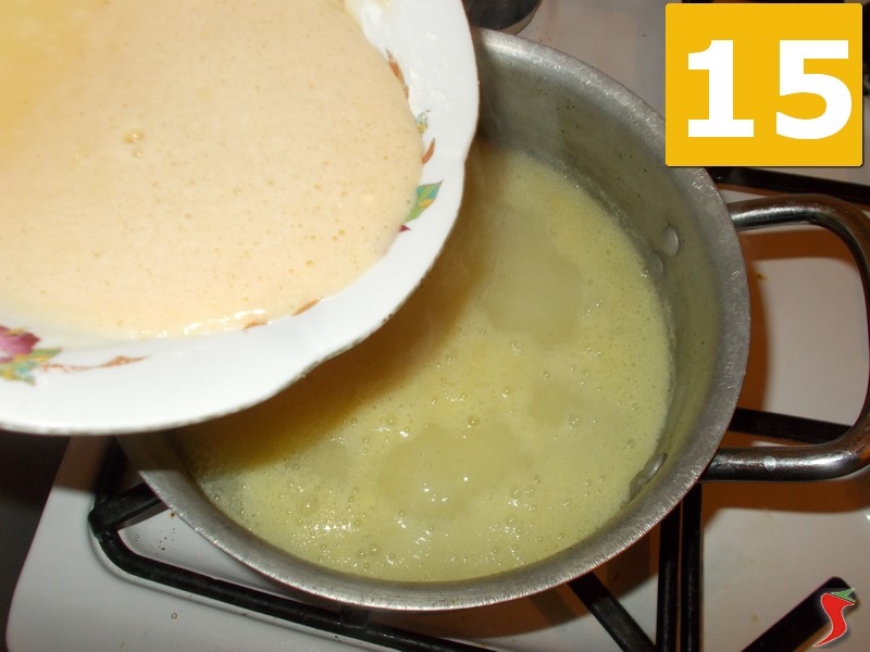 Quindi unite la farina setacciata alle uova (13) e sbattete bene (14) con la forchetta finché non avrete una pastella densa e uniforme. Quando le patate sono lessate per 40 minuti, aggiungete la pastella al brodo (15) con gli altri ingredienti e spegnete il fuoco.