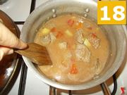 Una volta messa la salsa di pomodoro mescolate bene (16) per insaporire e quindi versate tutto il brodo (17) nella zuppa fino a coprire tutti gli ingredienti (18). Lasciate cuocere con il coperchio a fuoco basso per circa 40 minuti.
