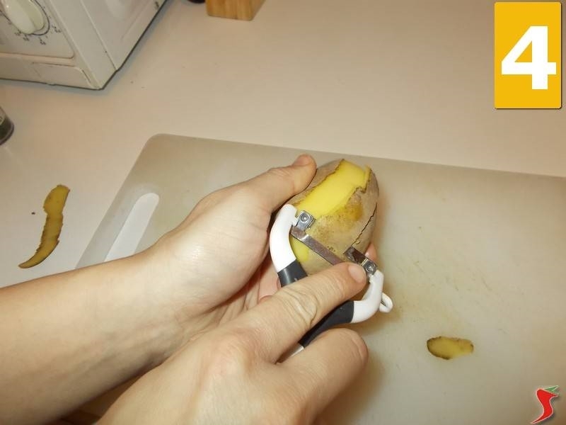 Ora sbucciate le patate (4) e quindi tagliatele a cubetti (5) con il coltello grande per metterle tutta parte (6) in una ciotolina.