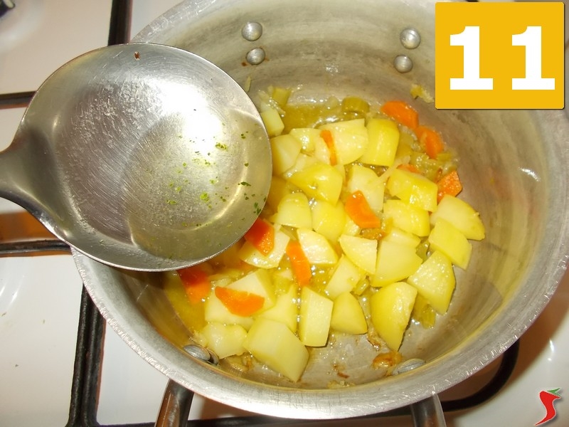 Fate insaporire le patate per circa cinque minuti coprendo con il coperchio (10). Dopo cinque minuti unite uno o due mestoli di brodo (11) e fate cuocere mescolando bene (12) per far insaporire, lasciando cuocere per circa 10 minuti.