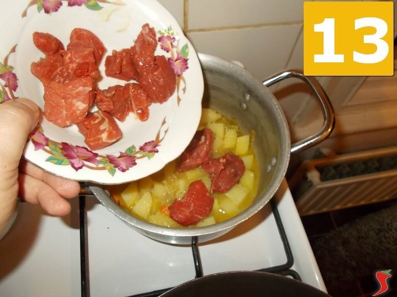 Una volta insaporite le patate unite anche la carne (13), mescolate e fate cuocere (14) per circa dieci minuti finché non ha preso colore. Quindi unite anche la passata di pomodoro (15) e continuate la cottura.