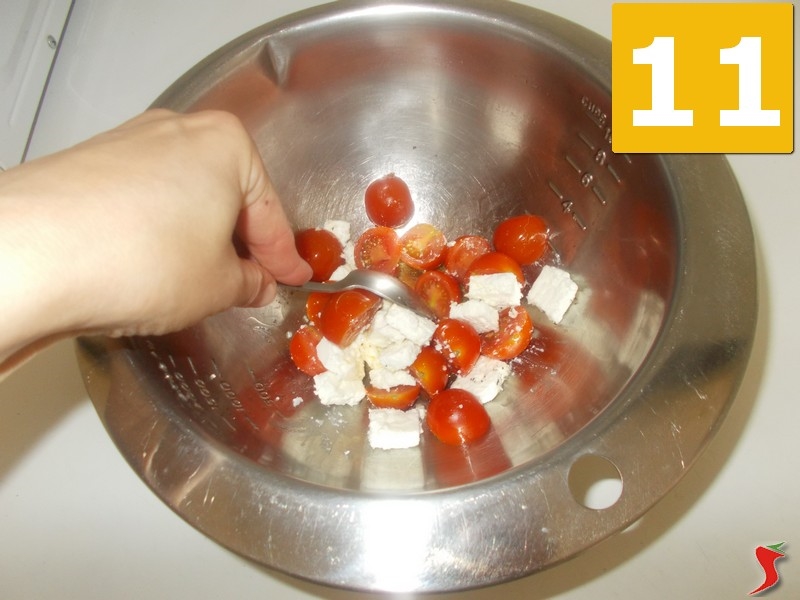 Ora prendete una planetaria oppure una terrina di medie dimensioni ed aggiungete al suo interno i pomodori pachino lavorati in precedenza (7) e proseguite unendovi anche la fesa a dadini (8). Spolverate di pepe nero macinato fresco a vostro gradimento (9).