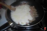 Mescolate la besciamella che intanto si sarà freddata e aggiungetela in padella al soffritto di scalogno e prosciutto. Mescolate con un cucchiaio di legno per amalgamare tutti gli ingredienti.