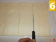 Ora con le mani aprite la pasta sfoglia senza togliere la carta forno con la quale è stata confezionata (4) e dopo con un coltello dalla lama seghettata, iniziate a tagliarla a strisce dello spessore di cinque centimetri circa (5) una volta completato questo passaggio, realizzate dei quadrati di media grandezza (6).
