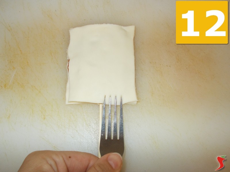 Una volta aggiunto il salame, aggiungetevi sopra i quadratini di formaggio cheddar che avete lavorato in precedenza (10) ed ora sovrapponete un altro quadrato di sfoglia coprendo il condimento interno (11). Proseguite prendendo una forchetta e facendo pressione lateralmente con la punta intorno al perimetro del quadrato di sfoglia (12). Ripetete la stessa operazione con il restante della pasta sfoglia e del condimento che avete a disposizione.