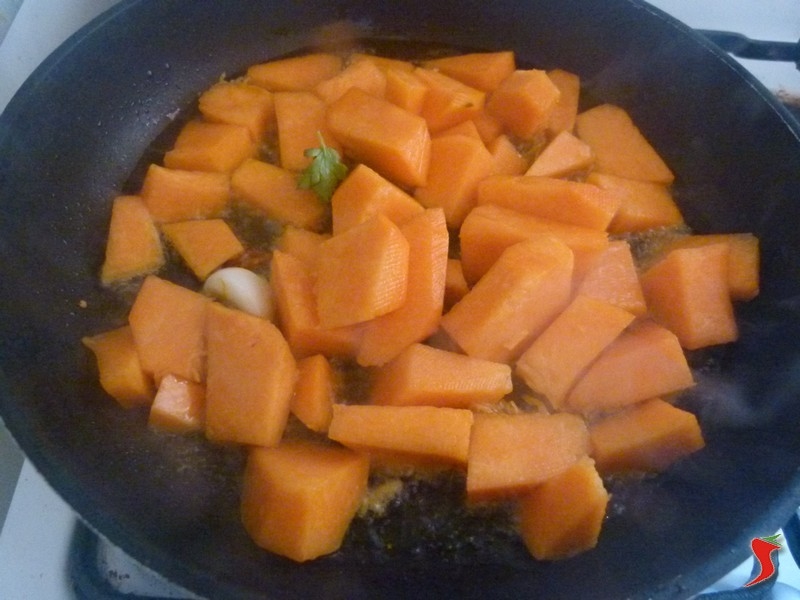 Prendere la zucca, ripulirla dai semi, togliere la buccia e tagliarla in vari pezzi. In seguito, lavare il tutto e andare poi ad aggiungere alla padella con l’olio extravergine di oliva e l’aglio.