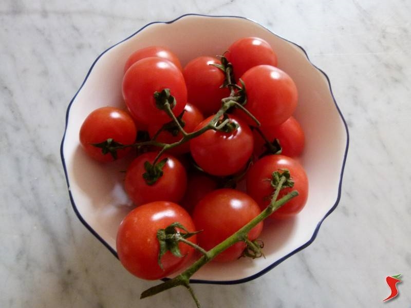 Prendere i 400 grammi di pomodori pachino e lavarli attentamente e privarli del loro ceppo verde prima di procedere con il taglio.