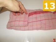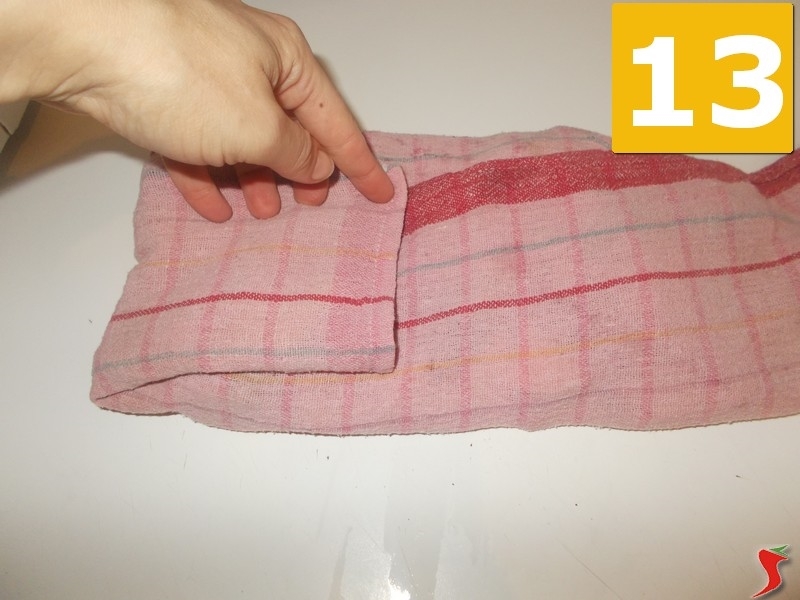 A questo punto chiudete il lato sinistro sollevando il lembo della stoffa (13) e ripetete la stessa cosa con la parte destra (14), girate l'involucro e fare una leggera pressione con il palmo delle mani, sempre per far assorbire l'acqua in eccesso (15).