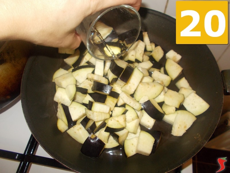 Prendete una padella di medie dimensioni antiaderente e versate al suo interno le melanzane in pezzi realizzati precedentemente (19), dopo aggiungetevi l'acqua utilizzando un bicchiere (20) ed unitevi due cucchiai abbondanti di olio di oliva extravergine (21).