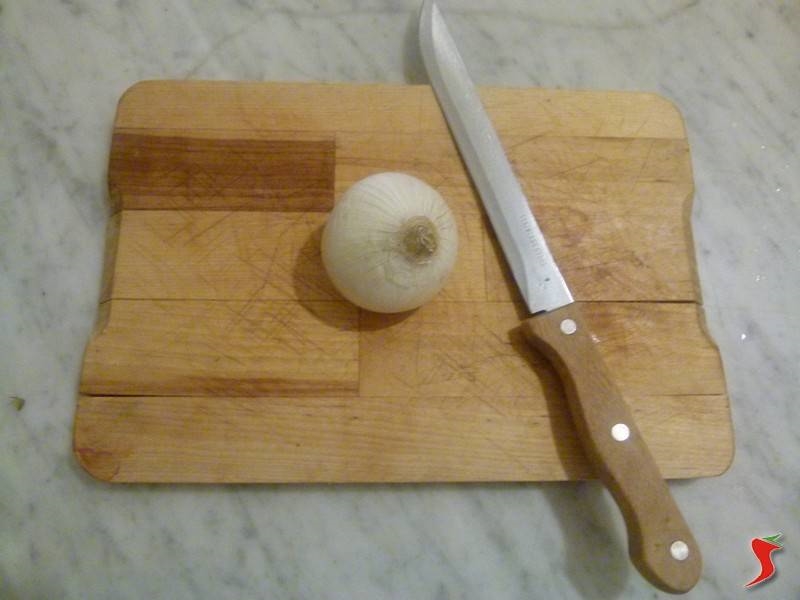 Infine, è il turno della cipolla: essa va privata delle due estremità e della sfoglia esterna. Poi si può proseguire con il tagliarla in quattro parti.