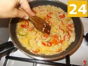 Una volta cotto il cous cous, trasferitelo dalla casseruola nella padella con il condimento realizzato in precedenza (22) e con un mestolo iniziate a mescolare (23), fino a quando tutti gli ingredienti non si saranno uniti bene tra loro (24). Impiattate e servite in tavola questo primo piatto nutriente accompagnandolo con del buon vino bianco dai sapori fruttati.