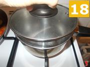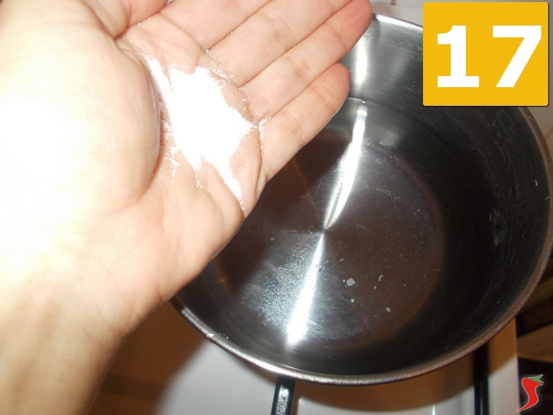 Prendete una casseruola di medie dimensioni e riempitela per metà di acqua corrente (16), ponetela sul fuoco ed una volta ben calda aggiustatela di sale fino a vostro gradimento (17), proseguite coprendo la casseruola con il suo coperchio e lasciando che l'acqua raggiunga la completa ebollizione (18).